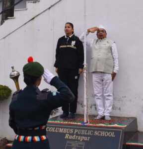 रुद्रपुर। स्थानीय मॉडल कॉलोनी स्थित शहर के प्रतिष्ठित कोलम्बस पब्लिक स्कूल के प्रांगण में सोमवार को देश का 77वां गणतंत्र दिवस पूर्ण गरिमा और देशभक्ति के जोश के साथ मनाया गया। तिरंगे की आन-बान और शान के बीच विद्यालय परिवार ने राष्ट्र के प्रति अपनी अटूट निष्ठा का संकल्प लिया।